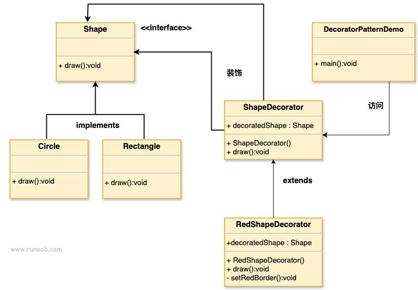 我们将创建一个 Shape 接口和实现了 Shape 接口的实体类。然后我们创建一个实现了 Shape 接口的抽象装饰类 ShapeDecorator,并把 Shape 对象作为它的实例变量。