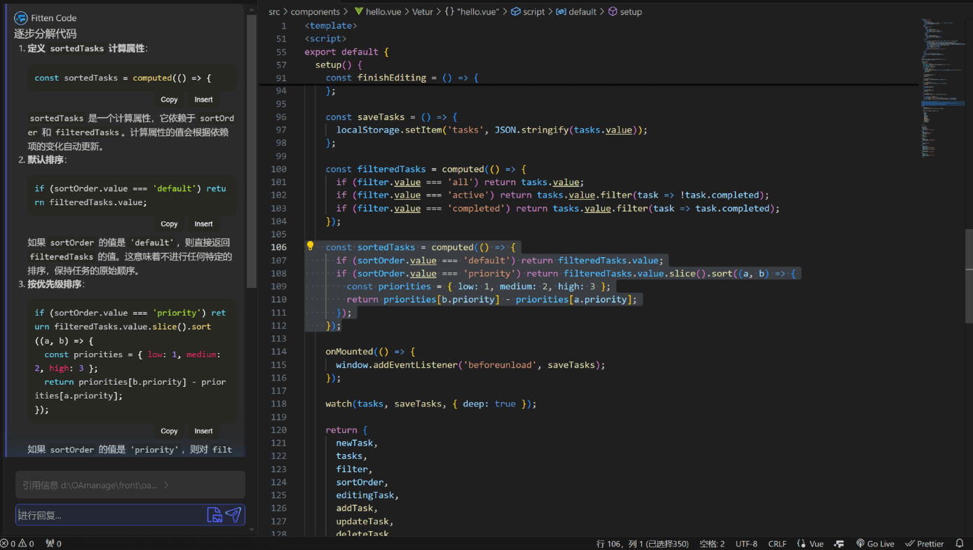 当用户选中文件中的代码段再进行对话时,Fitten Code 会自动引用用户所选中的代码段,此时可直接针对该代码段进行问询等操作: