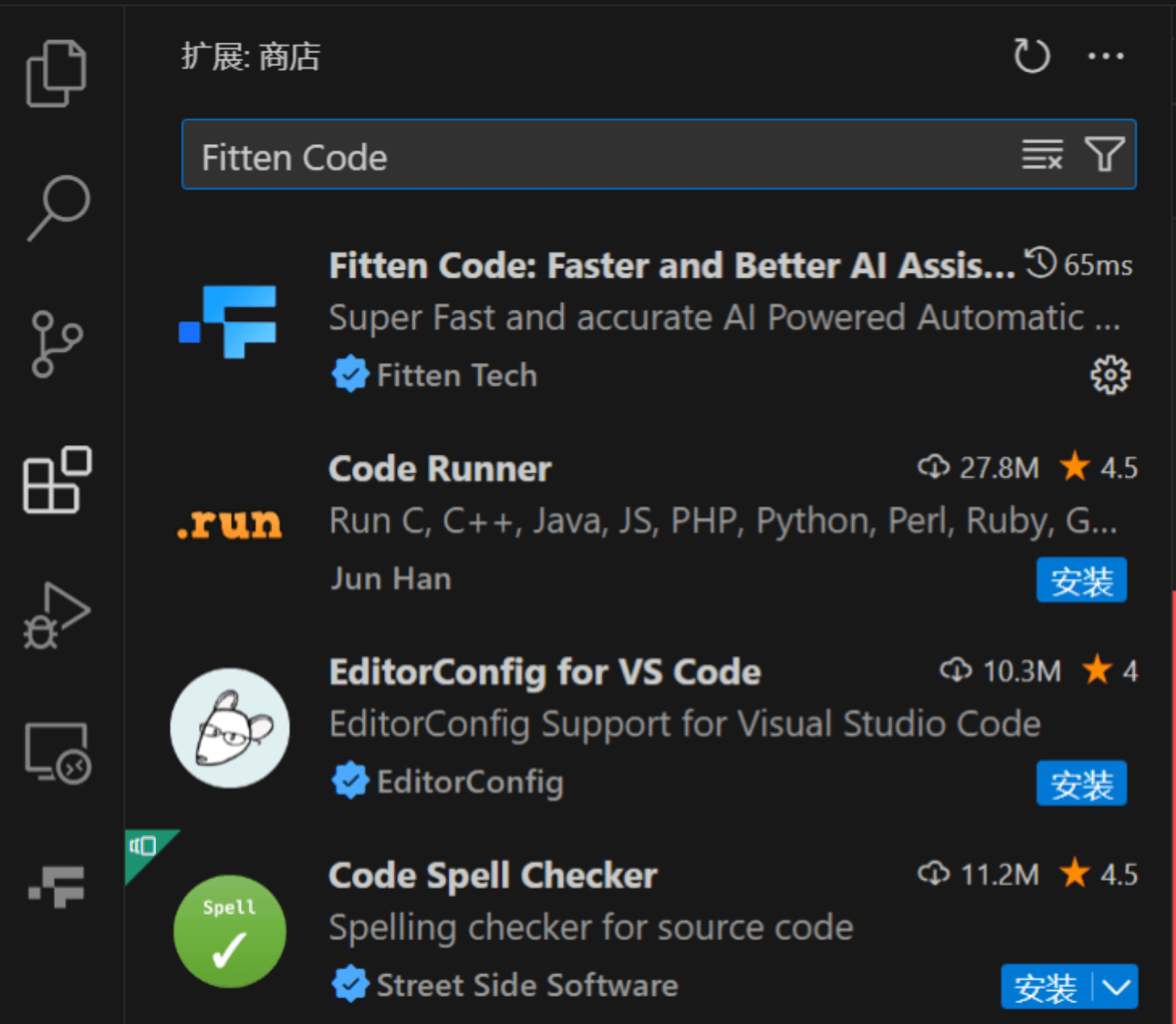 在搜索框中搜索关键字 Fitten Code: