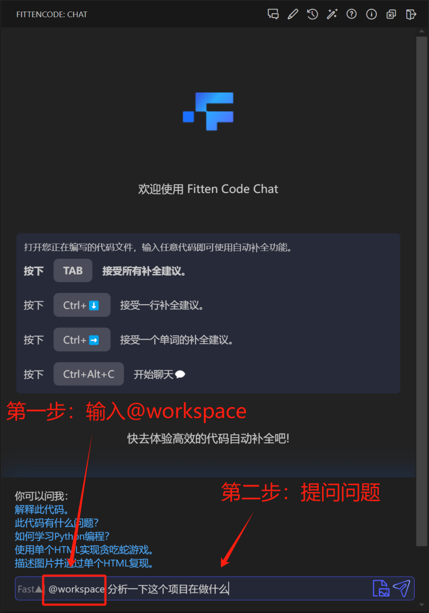 Fitten Code 的整项目感知分析功能,该功能会基于整个项目来解答你的问题,用户只需在对话框中以 \@workspace 开头,接着输入想要提问的问题即可。如下图所示: