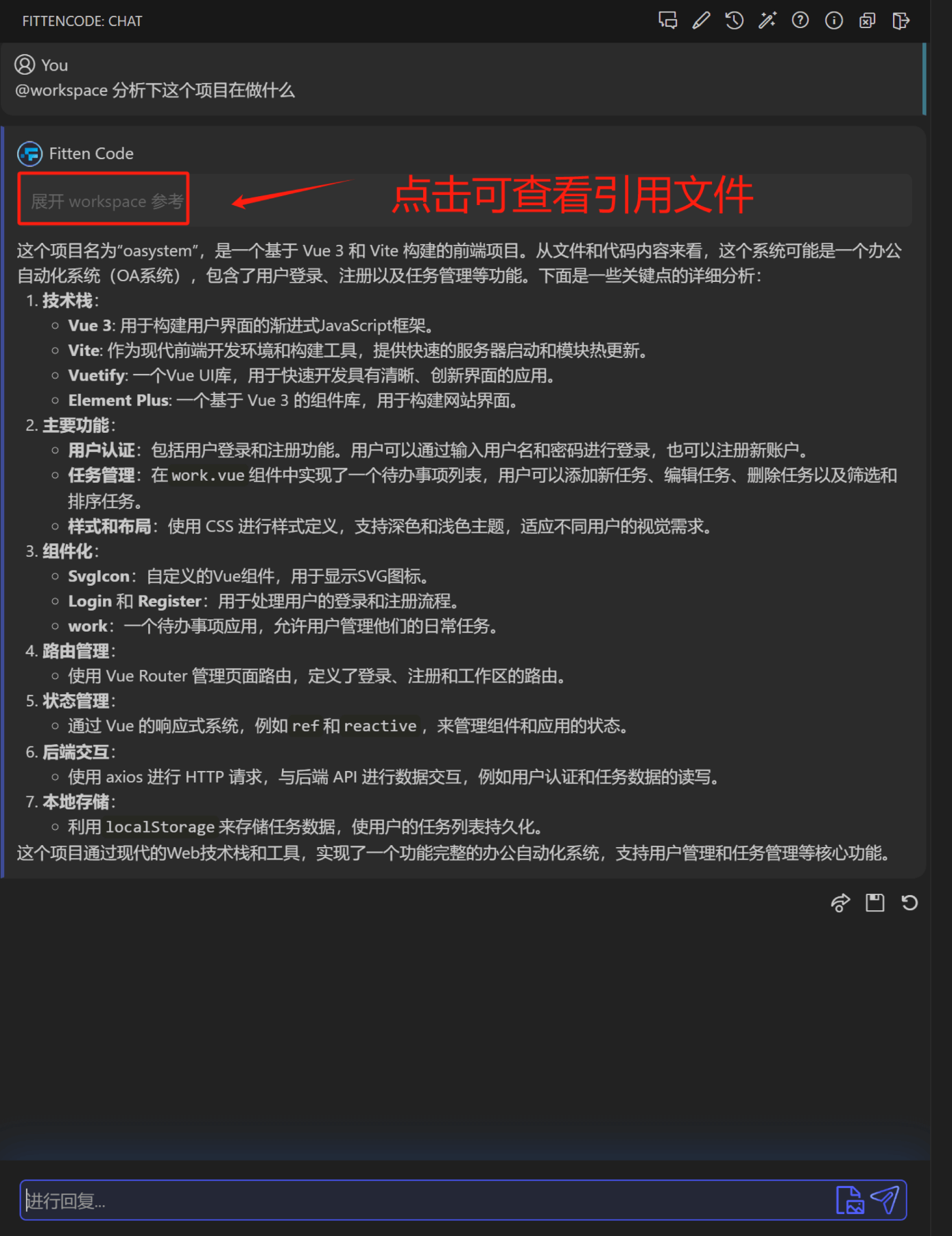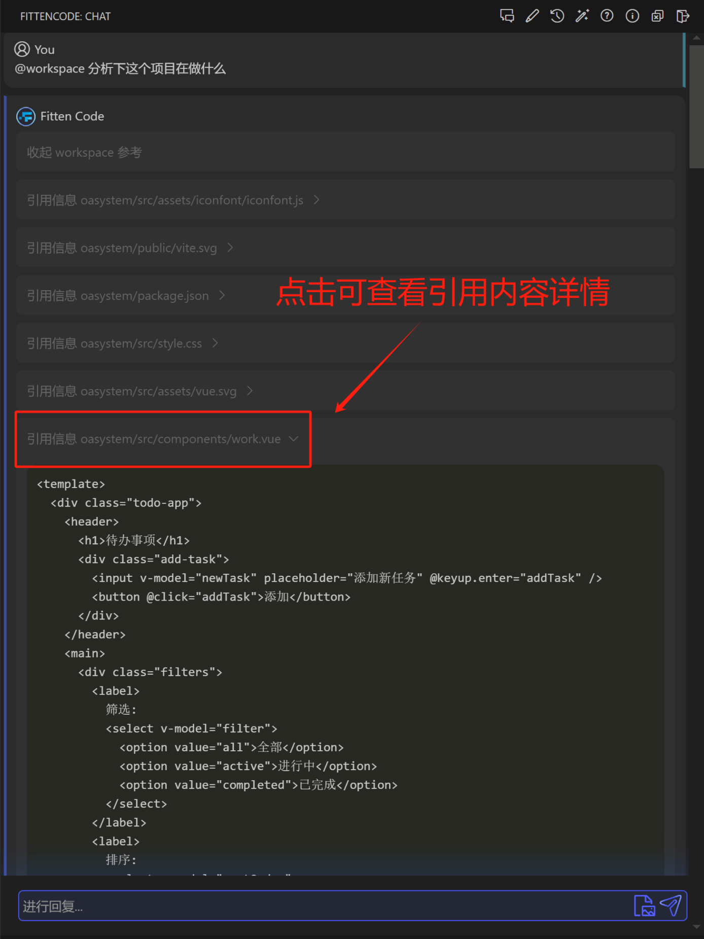 功能效果展示,Fitten Code 会将文件拆成多个部分进行分析和引用,用户点击展开 workspace 参考点击引用信息:便可看到引用详情,如下图所示: