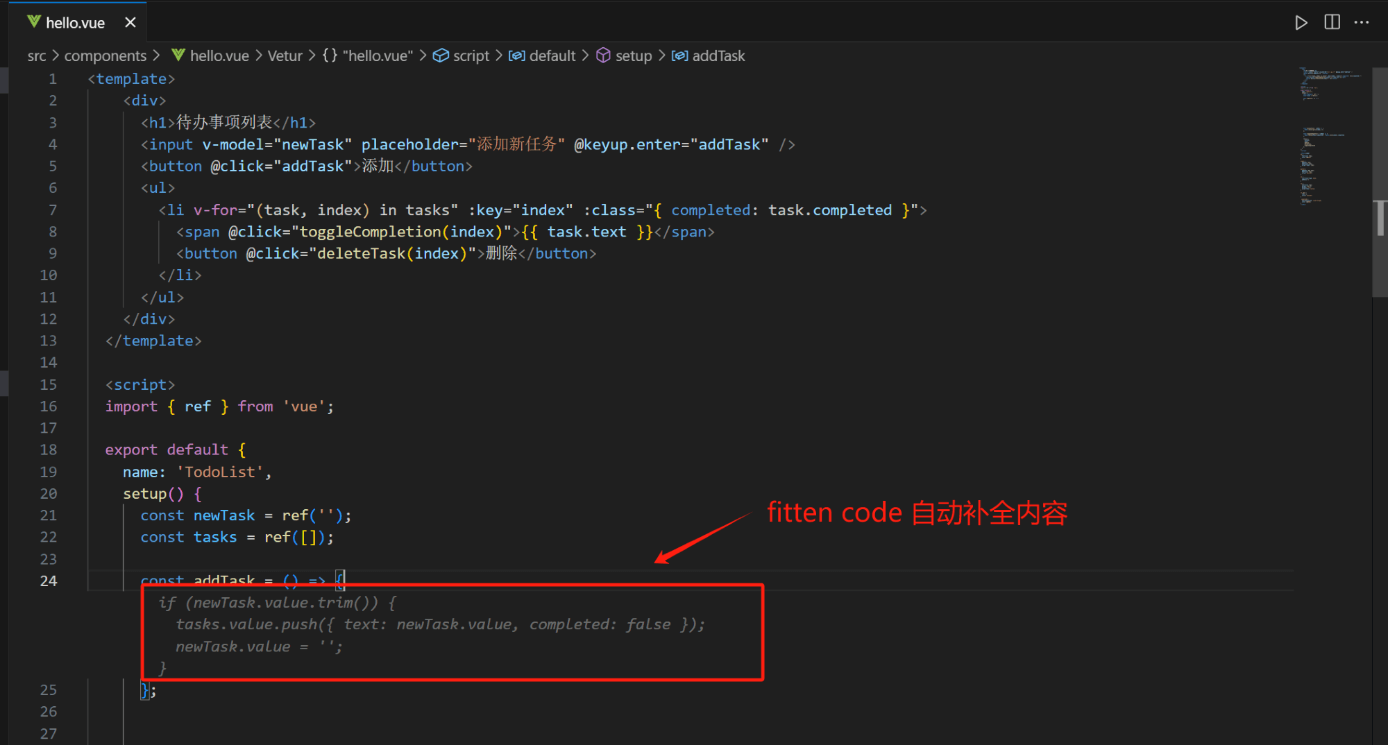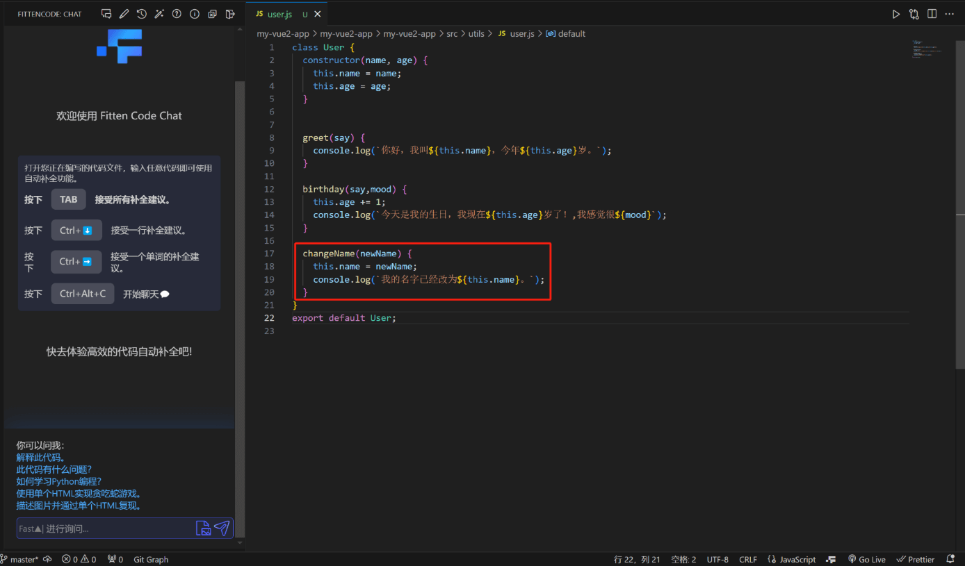 打开代码文件,输入一段代码,Fitten Code 就会为您自动补全代码: