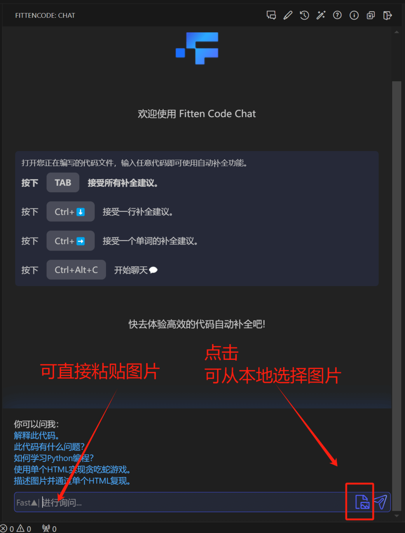 Fitten Code 的图片问答功能,为用户实现了可以在对话时使用图像问答的功能,用户可通过图像快速生成 HTML 代码、也可以通过图像查找 bug 等等。