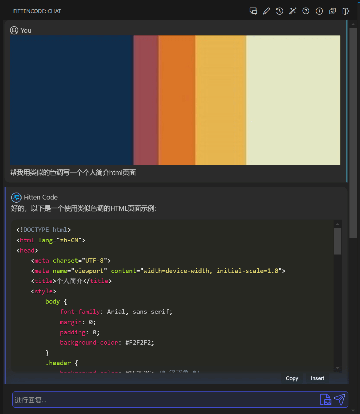 用户上传了一张色调板的图像,并询问如何使用 HTML 制作类似色调的个人介绍页面。