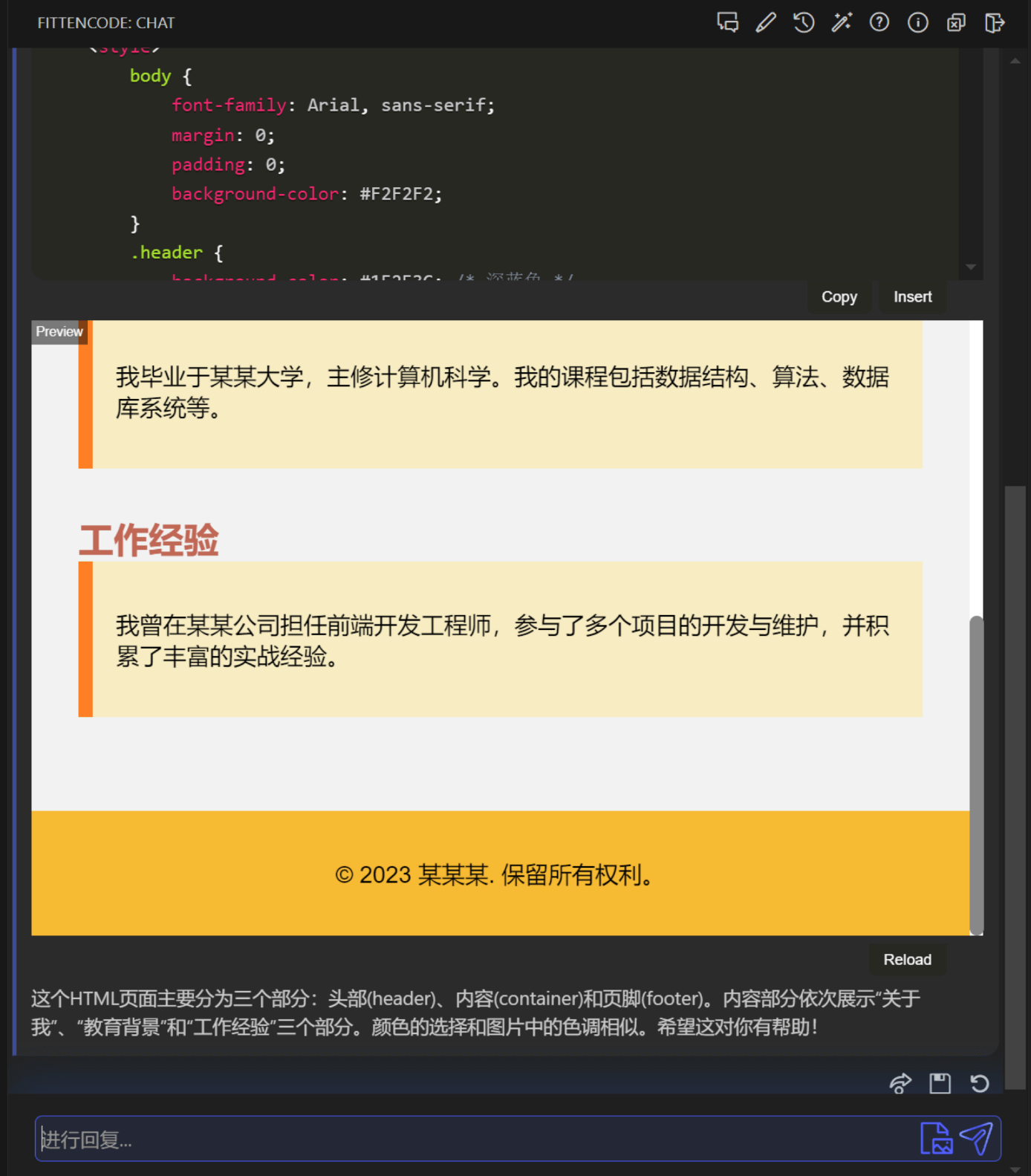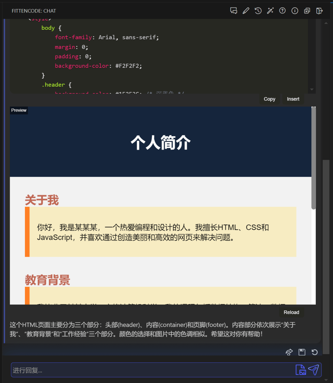 Fitten Code 生成的个人介绍网页效果,可以看到该网页色调与输入的图像色调一致。