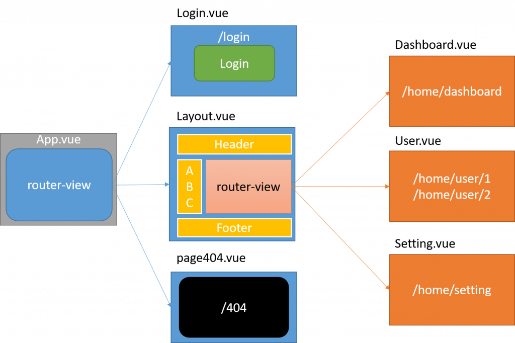 Layout.vue) 内部包含第二个<router-view>,用于渲染功能页面的子组件(如Dashboard.vue、User.vue),从而实现页头、侧边栏和页脚的持久化显示。 - 未匹配的路径最终会导向独立的